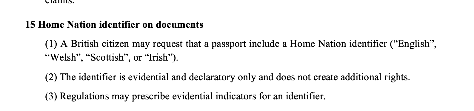 Subsection (2) makes that explicit – the label is evidential and declaratory only. In other words, it records an asserted and verified national identity within the UK’s constitutional family, but it does not confer extra rights, extra voting powers, different tax treatment, or any change to immigration status – it is also optional.