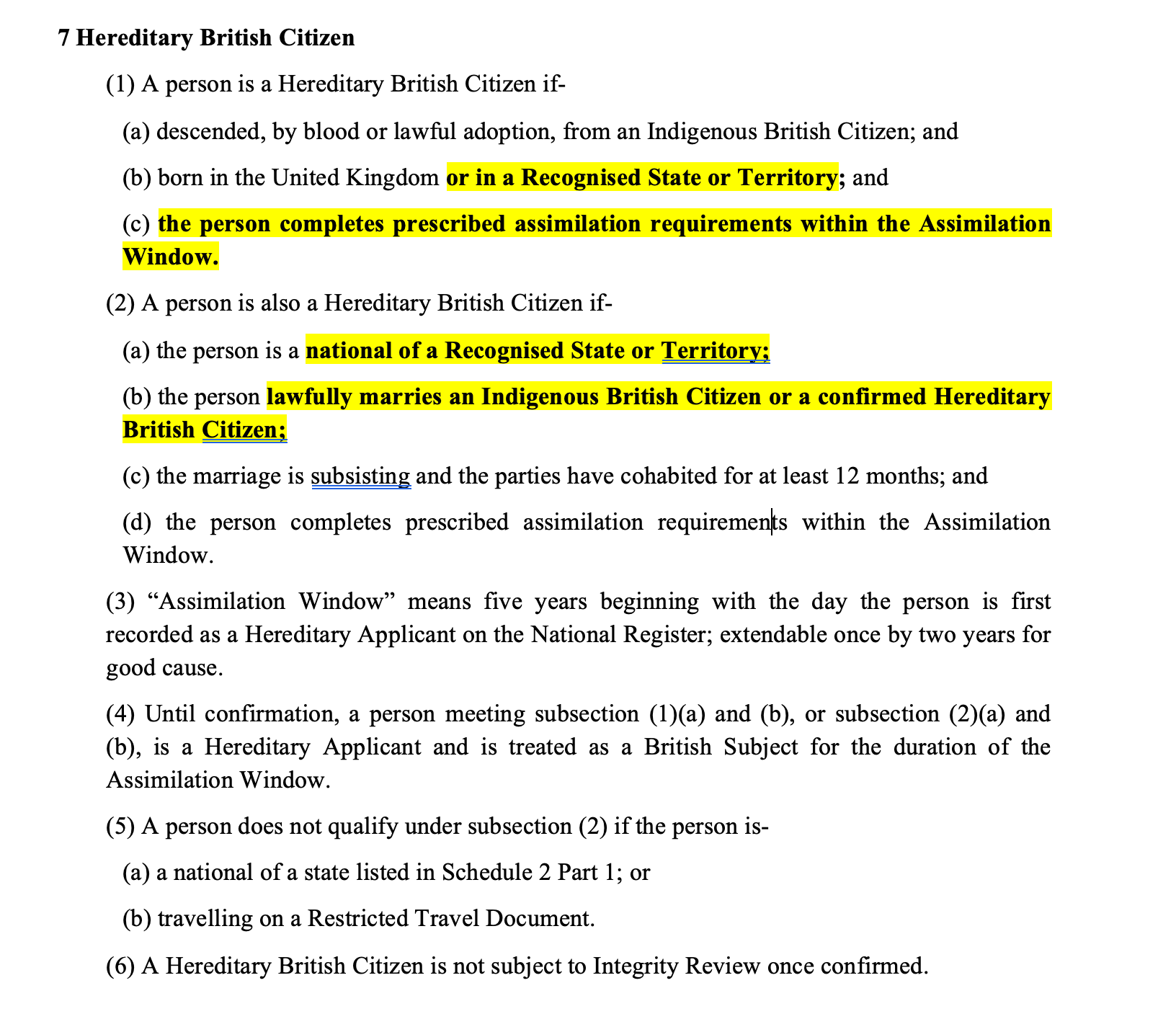 · Hereditary British Citizen extends the franchise to descendants of Indigenous citizens (by the method above) born either in the UK or in a Recognised State such as Canada or Australia, subject to a Swiss-style assimilation test (the Swiss are exceptionally good at these, we are not). It also creates a marriage route for nationals of Recognised States and Territories: the spouse is treated as a Hereditary Applicant and, during the assimilation window, as a British Subject.